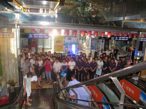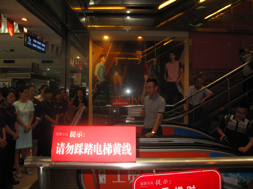 ?????? 鼓樓商場于7月29日早上組織全體員工進行電梯安全知識的培訓(xùn)和演練,同時檢查了商場自動扶梯標(biāo)識是否齊全,保證商場內(nèi)所有樓層扶梯兩側(cè)貼有 “請照看好老人和小孩”、“請勿掉落硬物”、“請勿將身體各部伸入電梯” 、“請勿逆行” “請勿在電梯上嬉戲”、“勿推童車乘梯” 、“勿攜貨車乘梯”等半透明警示牌。在每部扶梯上下兩端都有“STOP”按鈕旁邊特地做了醒目的紅底白字“緊急制動”的標(biāo)志提示。