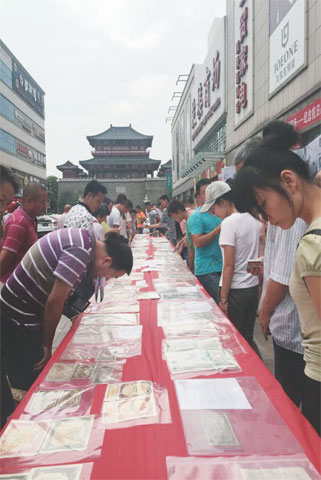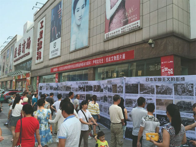 9月3日,鼓樓商場(chǎng)在鼓樓文化廣場(chǎng)舉辦紀(jì)念中國(guó)人民抗日戰(zhàn)爭(zhēng)暨世界反法西斯戰(zhàn)爭(zhēng)勝利70周年圖片展活動(dòng)?;顒?dòng)得到尹明友先生的支持,他拿出私人收藏的近百件抗戰(zhàn)歷史物品展出。