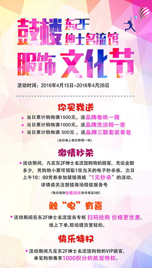 4月15日,鼓樓商場(chǎng)東二樓紳士名流館攜手眾合作伙伴傾力打造“鼓商服飾文化節(jié)”,把時(shí)尚正能量傳遞給廣大消費(fèi)者。