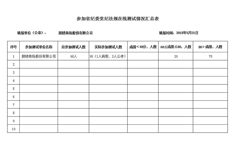 2、5月28日,紀(jì)檢監(jiān)察室以各經(jīng)營賣場、部室、分公司為單位下發(fā)了鼓樓商場《關(guān)于全市開展“宣教月”知識測試的通知》,并附知識測試情況表,要求如實(shí)上報測試成績。